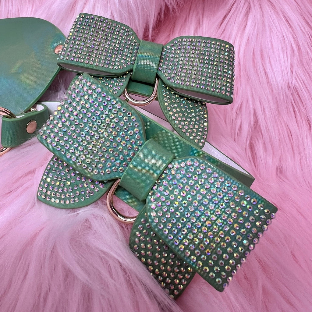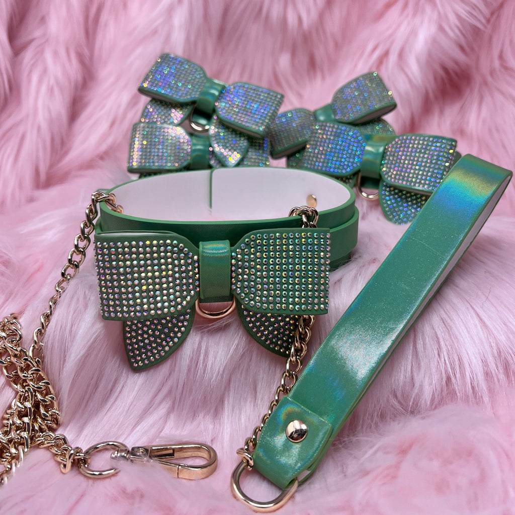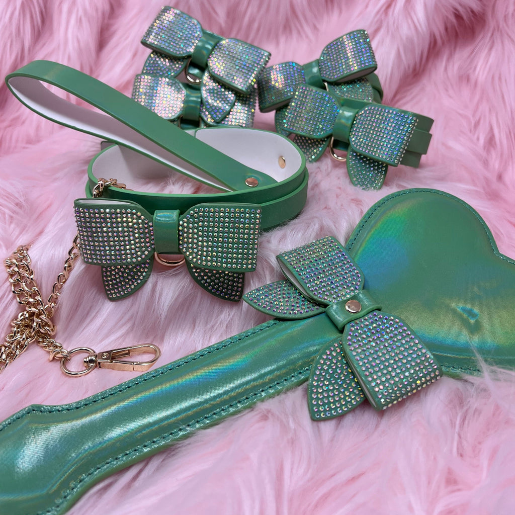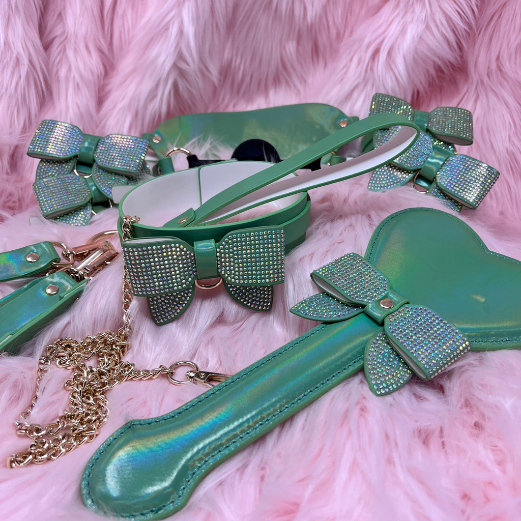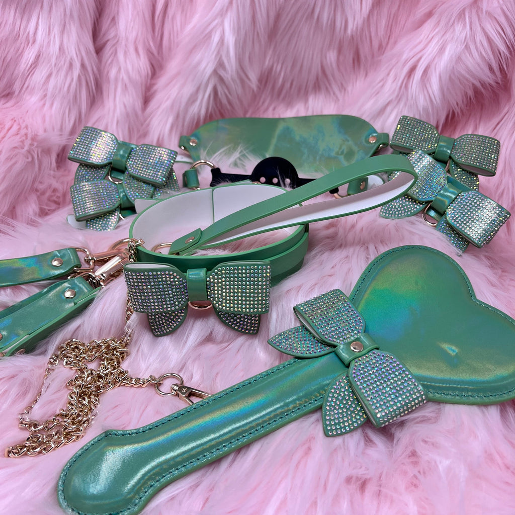 This beautiful faux leather set contains everything you need to explore BDSM. All items are made with high quality faux leather which is cruelty free. This set is especially soft and nice to the touch with holographic black/grey/blue effect & rhinestoned black bows ♡