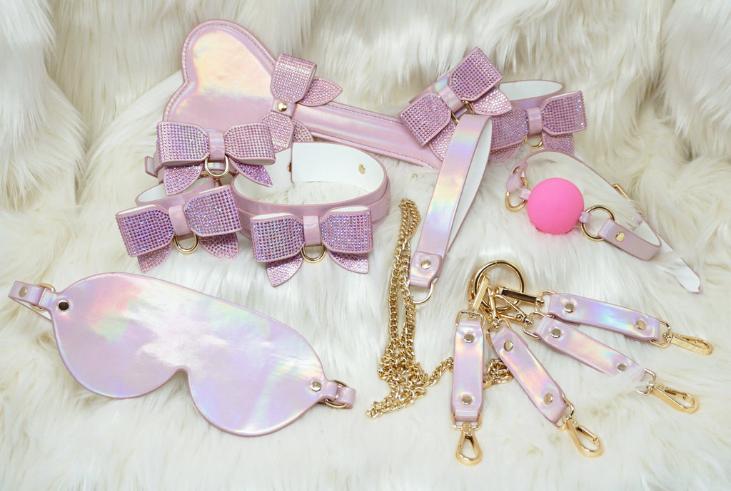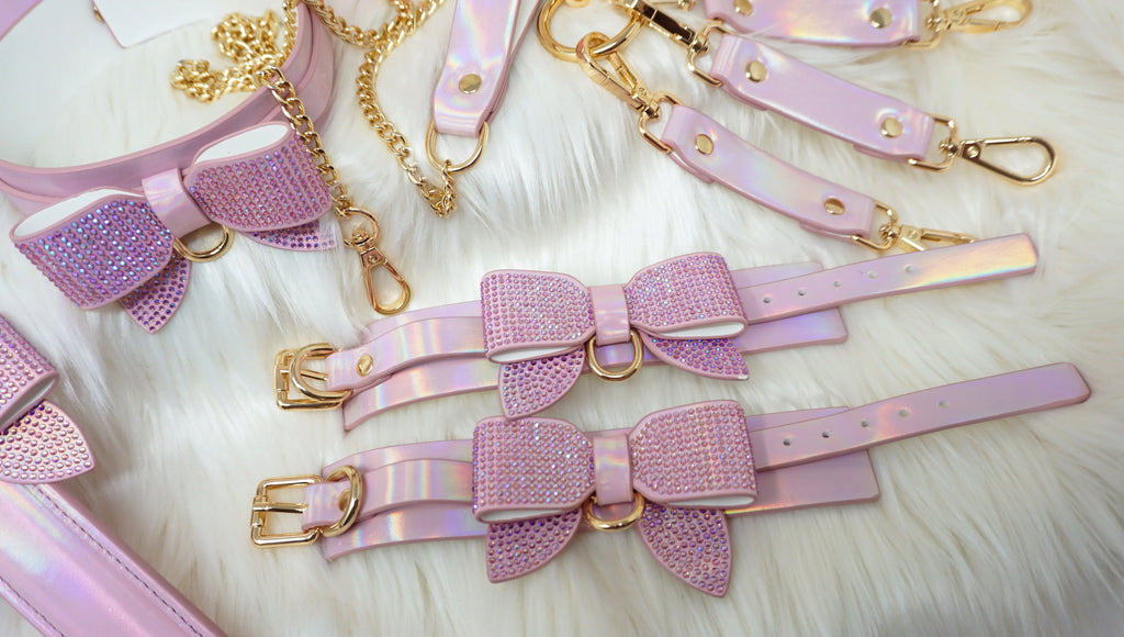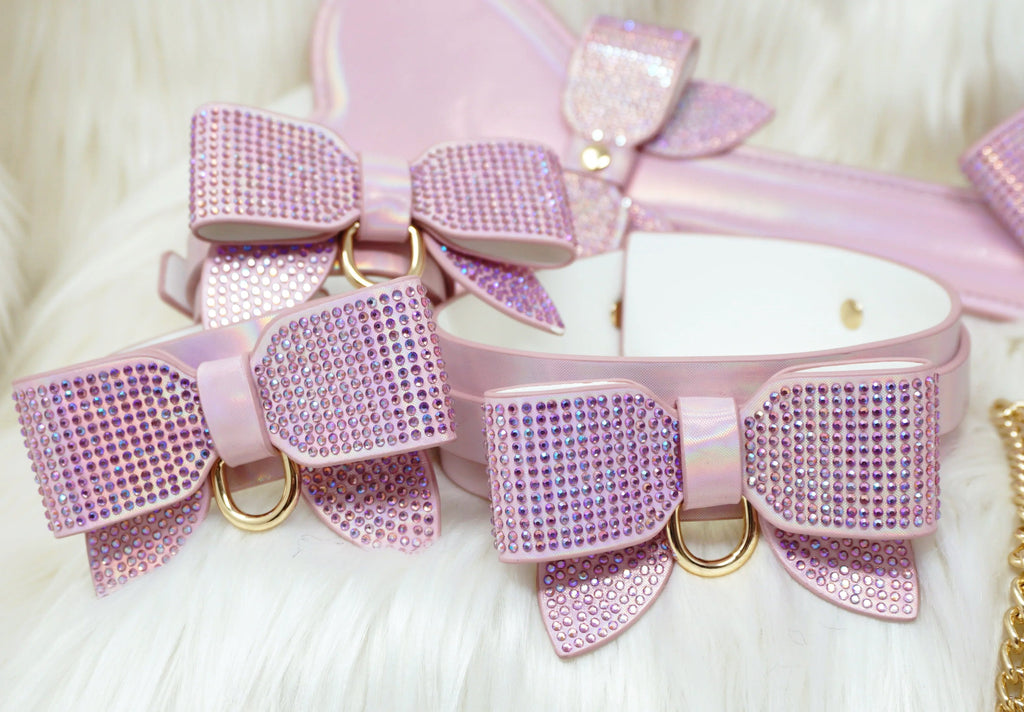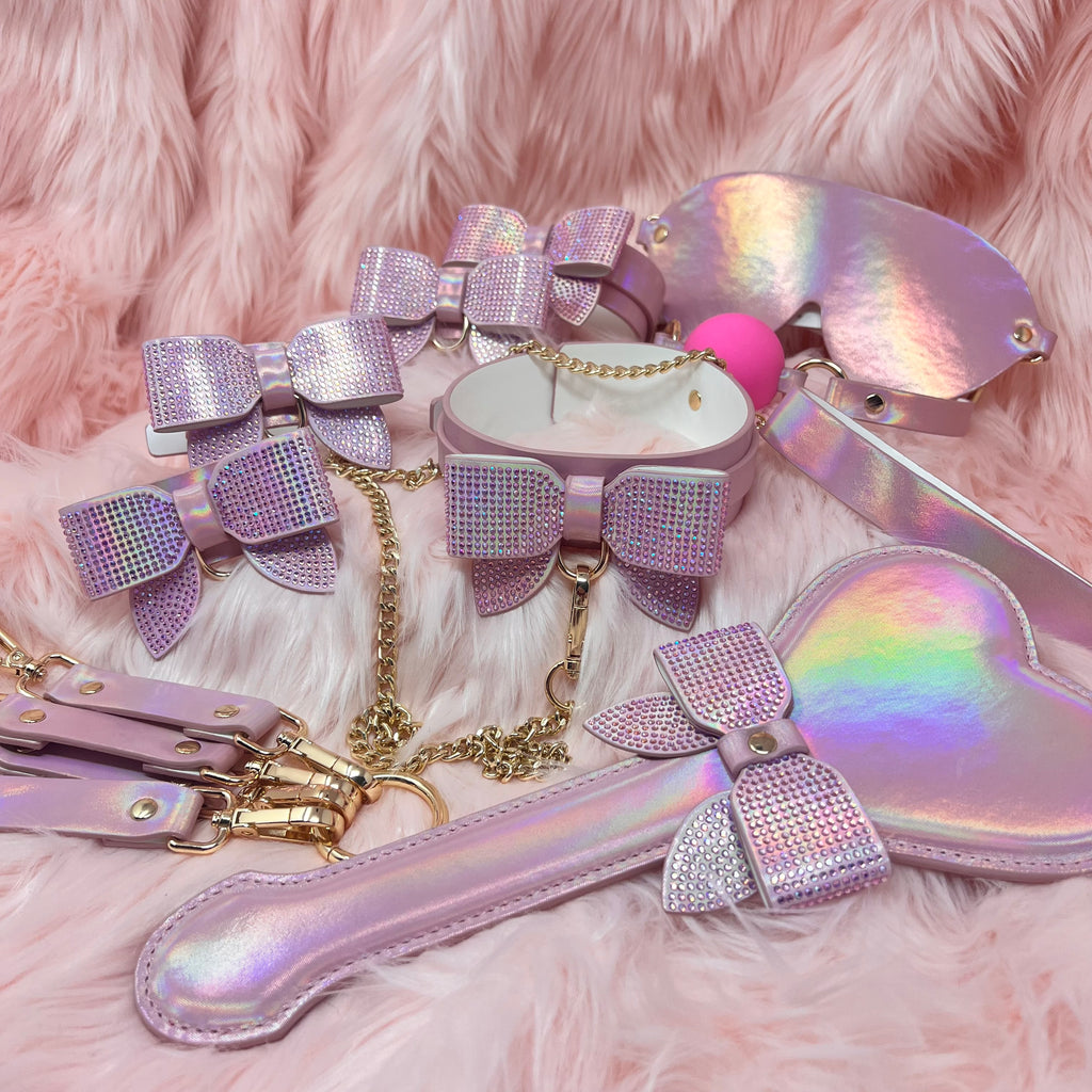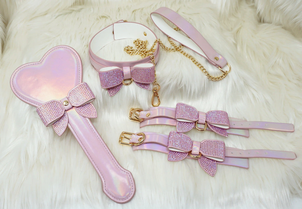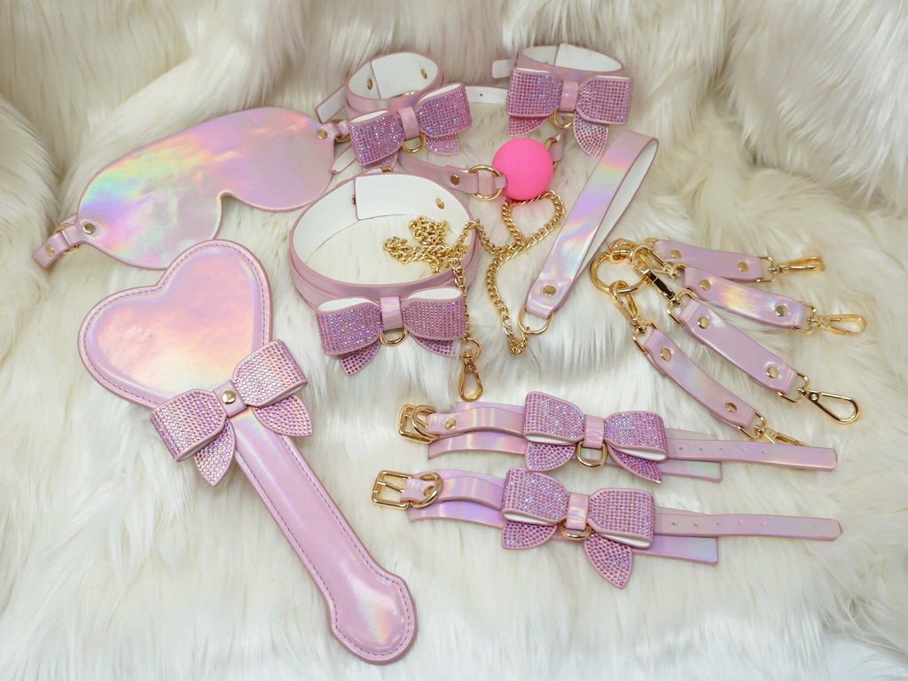 This beautiful faux leather set contains everything you need to explore BDSM. All items are made with high quality faux leather which is cruelty free. This set is especially soft and nice to the touch with holographic pink effect & rhinestoned pink bows ♡