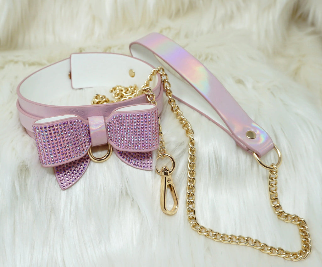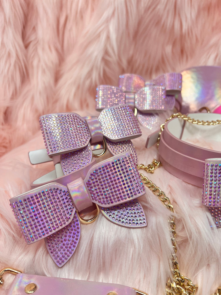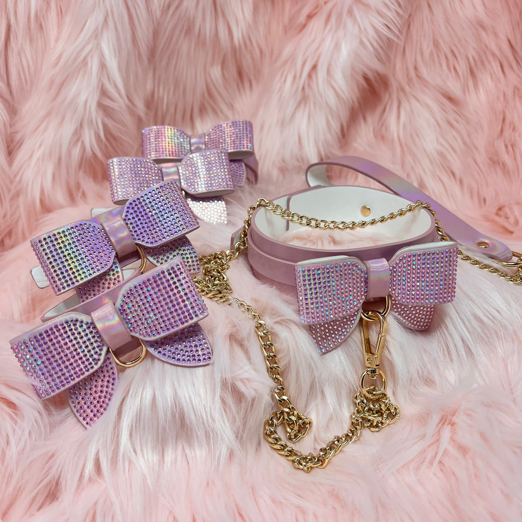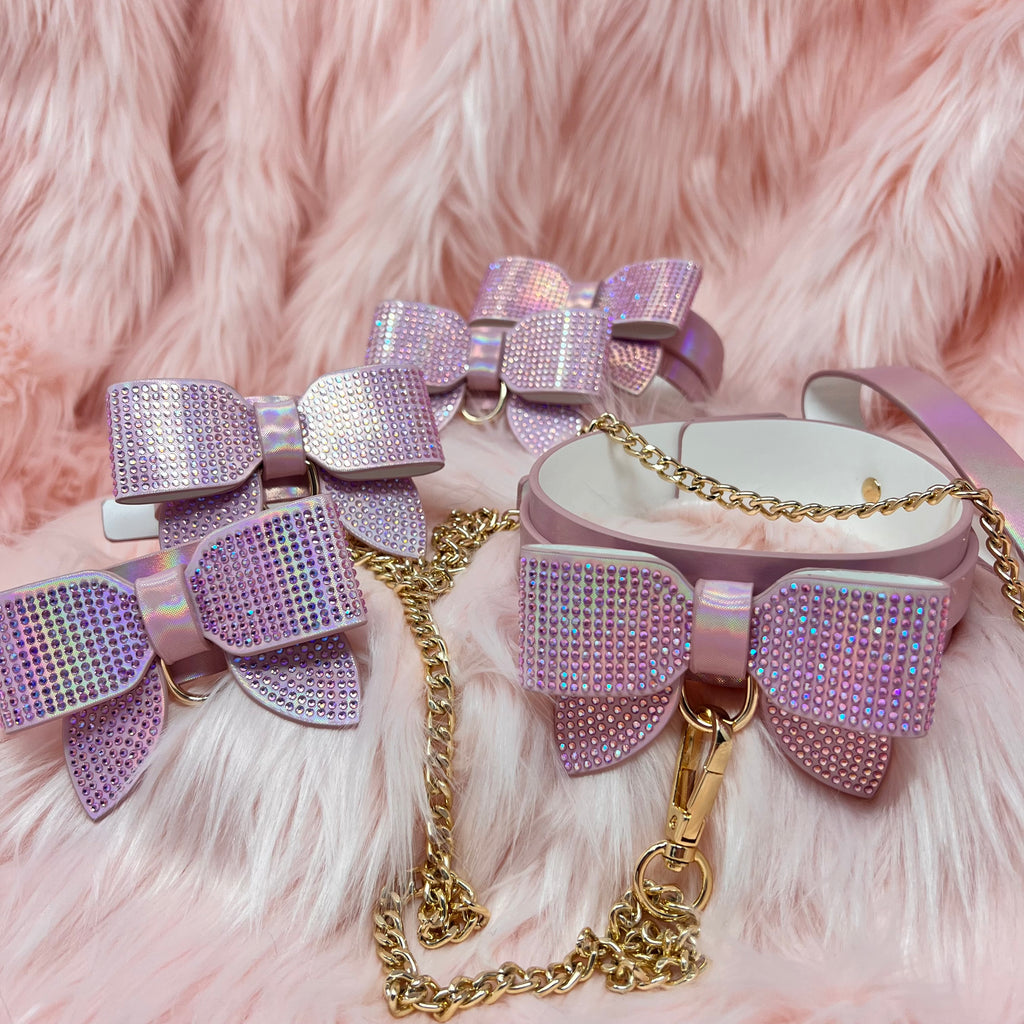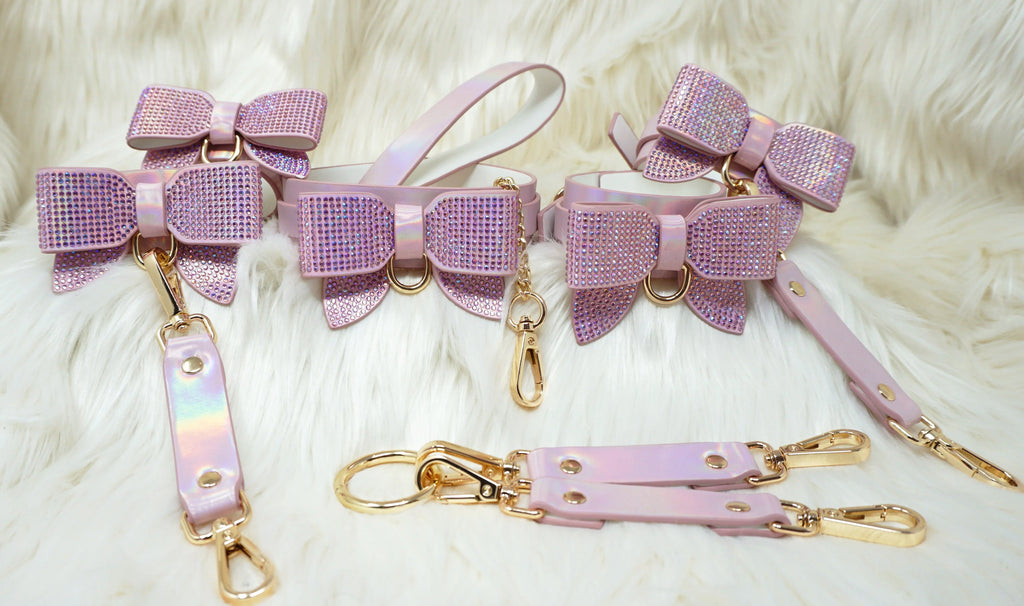 This beautiful faux leather set contains everything you need to explore BDSM. All items are made with high quality faux leather which is cruelty free. This set is especially soft and nice to the touch with holographic pink effect & rhinestoned pink bows ♡
