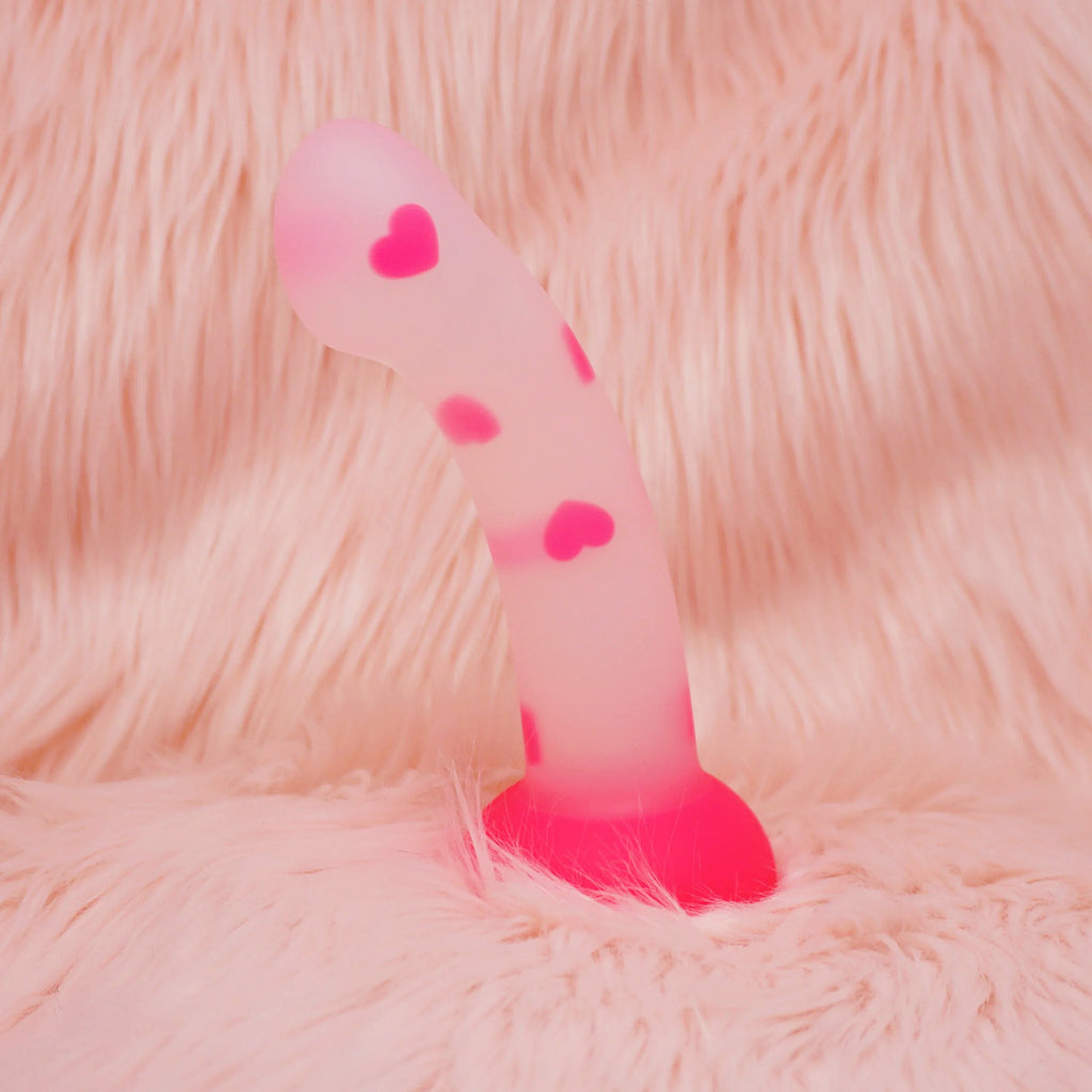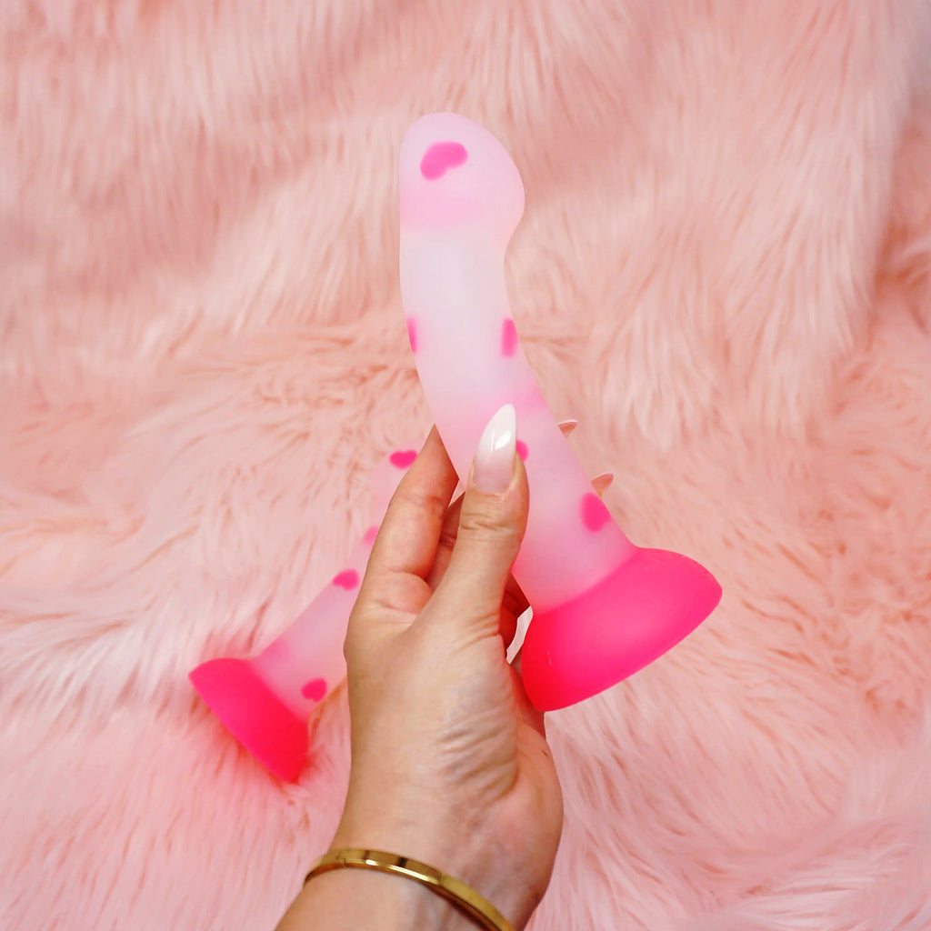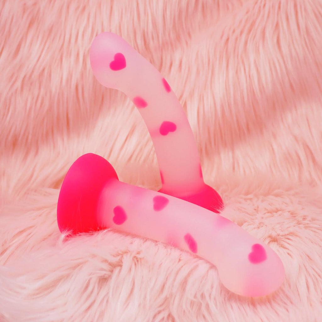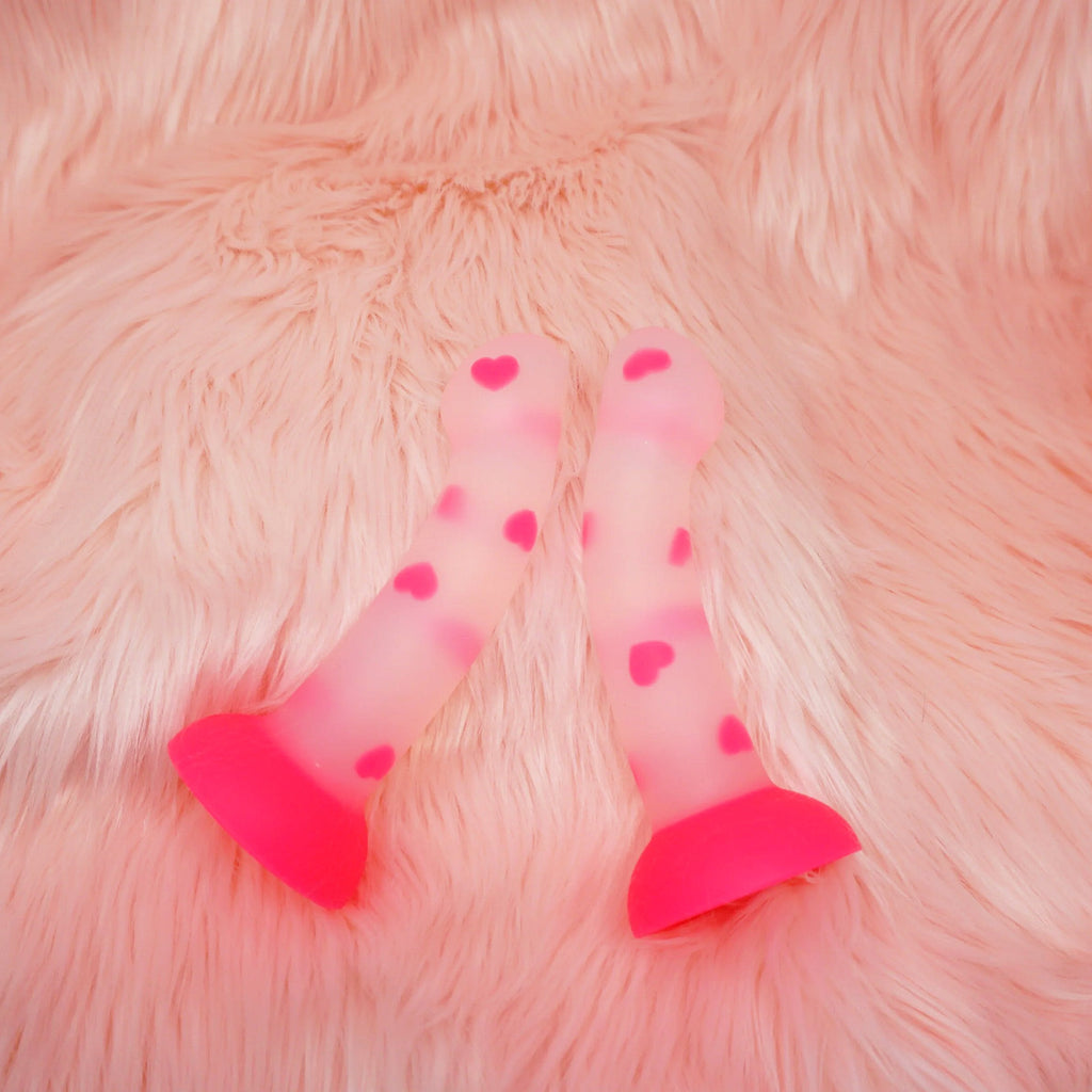 These sweet silicone dildos are soft and flexible with a cute heart pattern inside. They also include a suction cup for use with strap on/solo play.