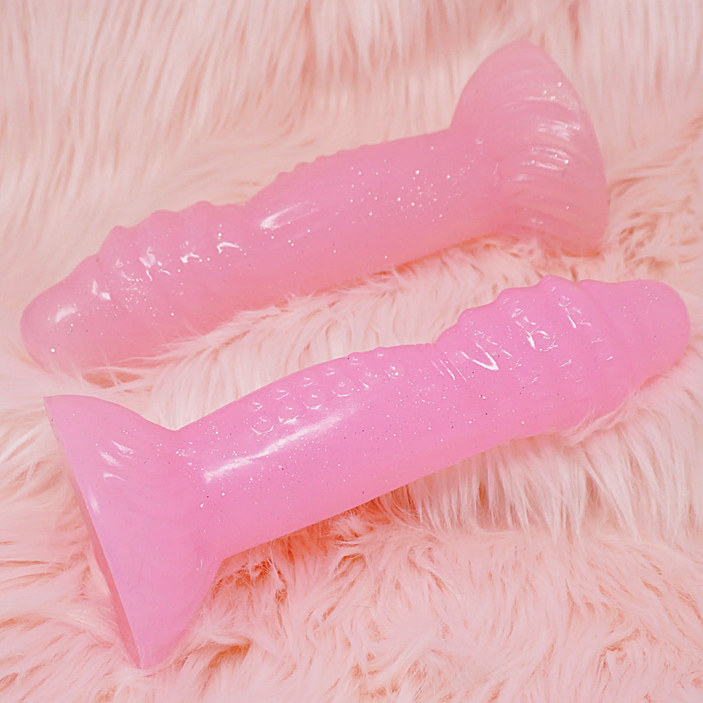 The most beautiful fantasy dildo with dragon style vibes. Ridged edges, lots of texture and moulded detailing and pink silicone with sparkling glitter inside! These are a slightly firmer silicone, but still with flexibly and bounce. Please note, these babies are on the bigger size and well weighted. The include a very wide and strong suction cup with great grips with great stability on any flat surface. Ideal for solo play.