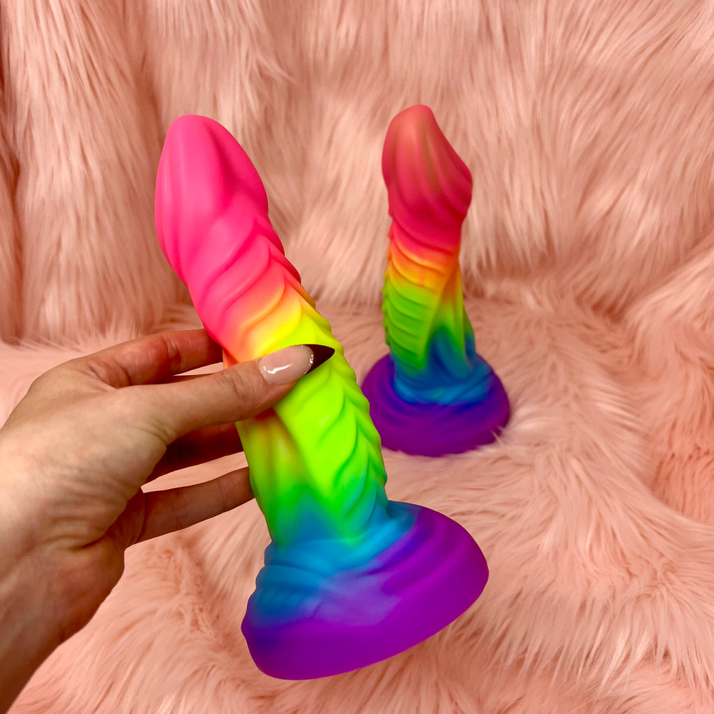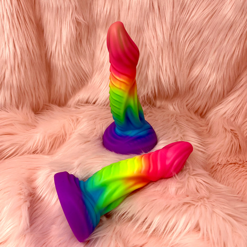 These sweet silicone dildos are soft and flexible with rainbow stripes. They also include a suction cup for use with strap on/solo play.