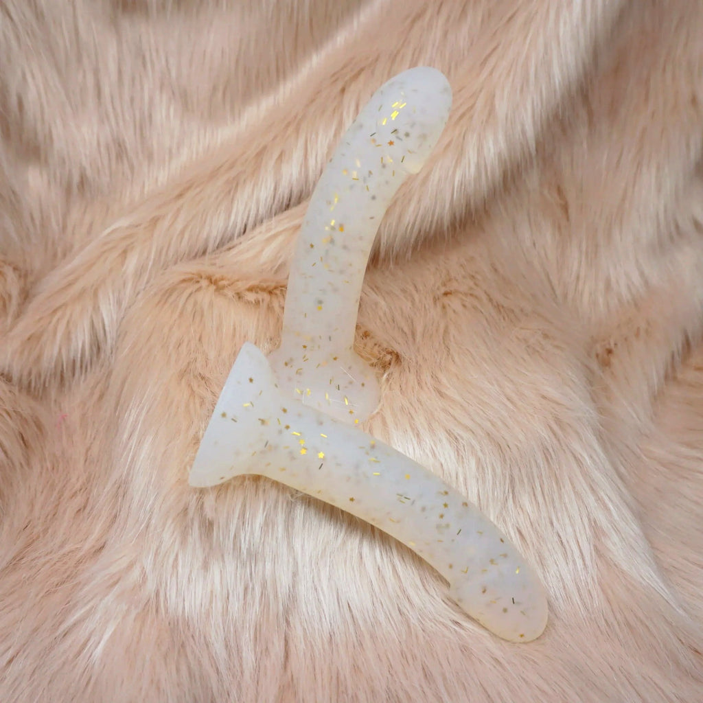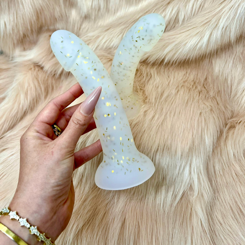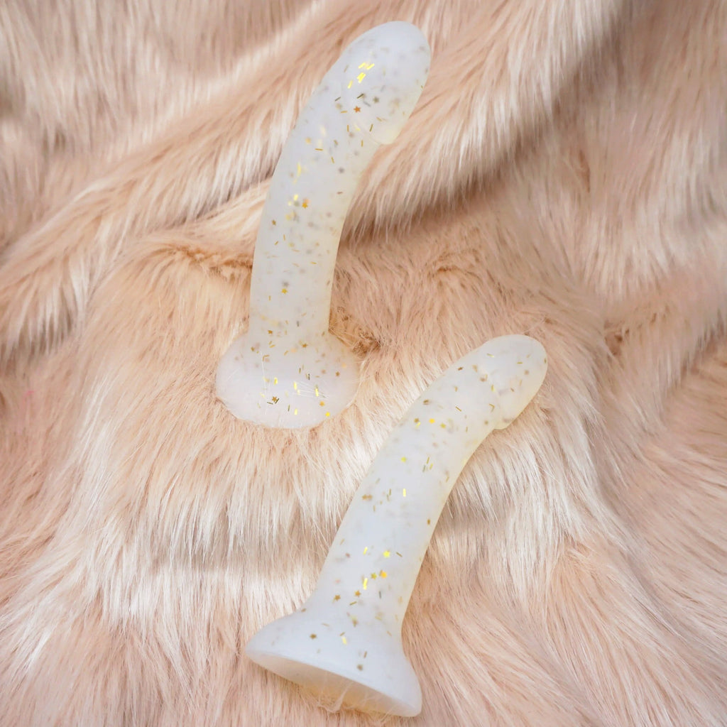 These sweet silicone dildos are soft and flexible with golden glitter inside. They also include a suction cup for use with strap on/solo play.