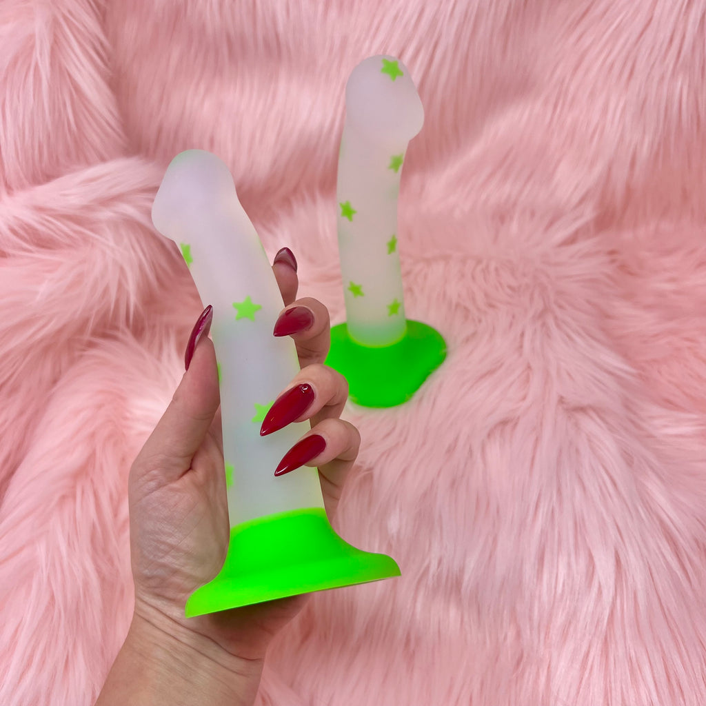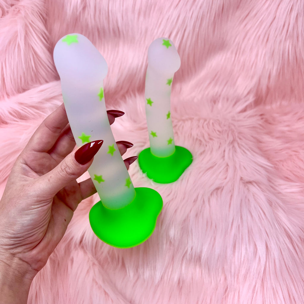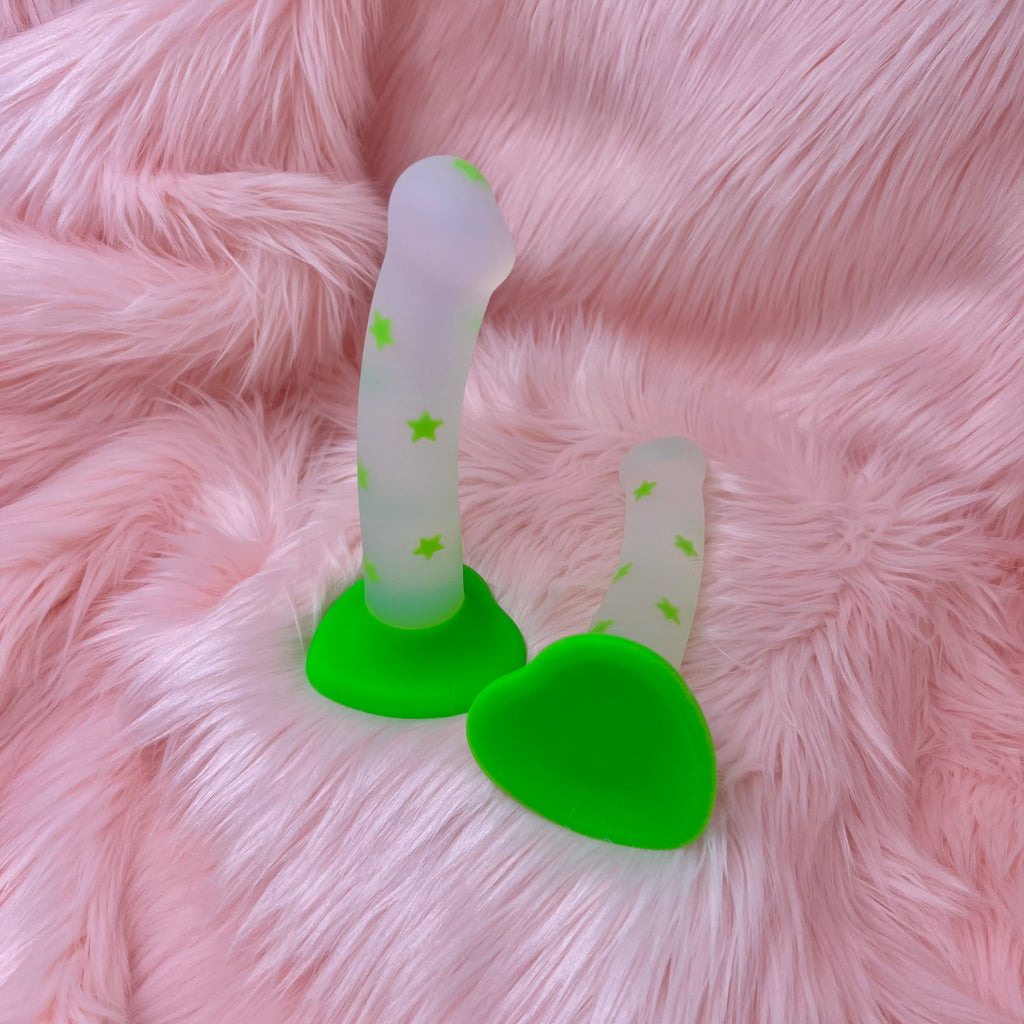 These sweet silicone dildos are soft and flexible with a star heart pattern inside. They also include a heart 💚 suction cup for use with strap on/solo play.