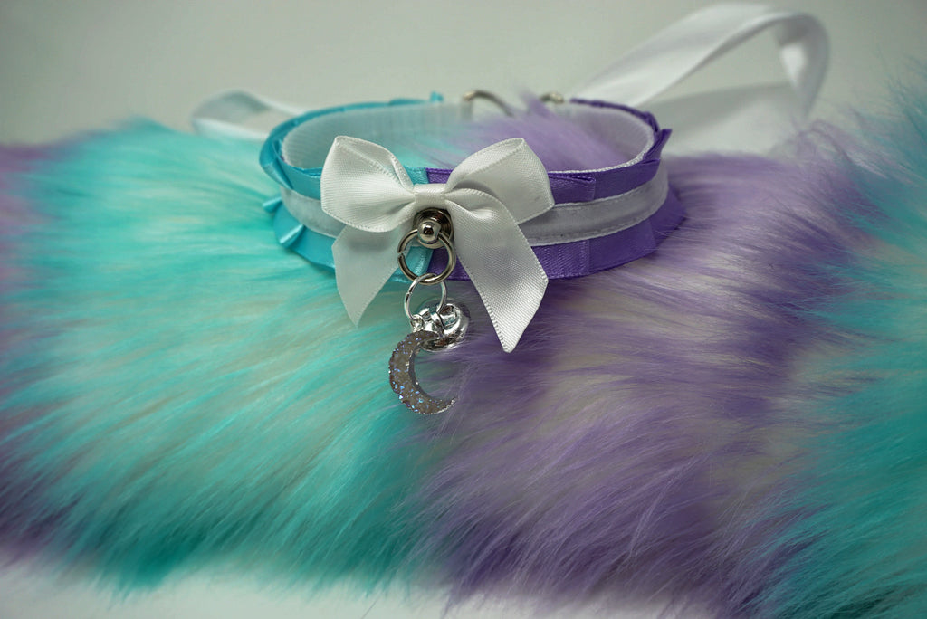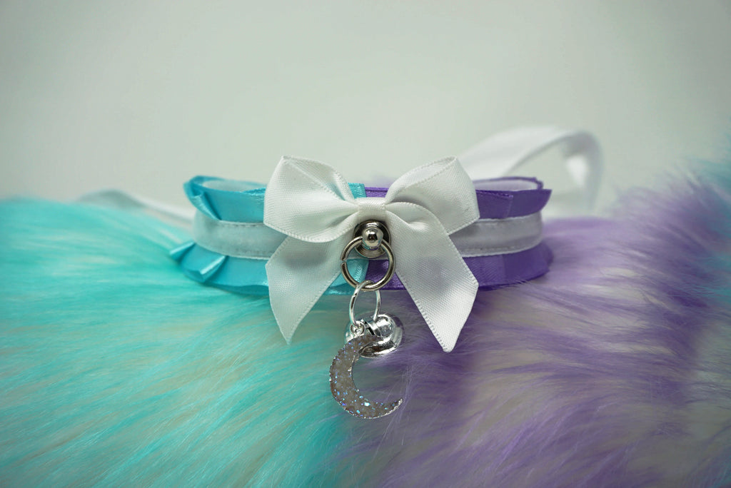 Two Tone Satin Collar with geode moon charm & silver bell